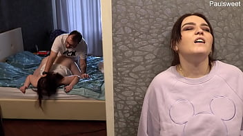 Perverted stepdaughter eats her stepfather's cock while her mother watches and masturbates
